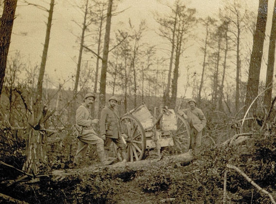 4 octobre : Levé à la pointe du jour je m’assure avec Lemasson que tout est en ordre pour le départ. J’ai recommandé aux gradés de veiller avec soin à la tenue de leurs hommes et à l’arrimage des paquetages ainsi qu’à la propreté des chevaux pour que nous puissions faire dans le secteur de Verdun une entrée sinon sensationnelle tout au moins honorable. De plus le commandant Annibert étant déjà parti à Verdun le groupe sera commandé pendant la route par le capitaine d’Ainval. Connaissant la haine de ce dernier pour la 10ème batterie je tâche que rien ne lui donne une occasion ou plutôt un prétexte de nous adresser des paroles désagréables. A mesure qu’une voiture est prête elle va se ranger sur la route. La 12ème batterie arrivant sur ces entrefaites s’arrête derrière nous lorsque d’Ainval aperçoit Lemasson et lui montrant des voitures le long de la route : « Lemasson, ces voitures sont très mal équipées ! –Mon capitaine, répond Lemasson froidement, elles sont à la 12ème batterie ». Tête de d’Ainval qui tourne le dos sans répondre. L’ordre de la colonne étant 10-12-11 et le point initial étant à 100 mètres sur la route où je dois passer à 8 heures, je m’ébranle en tête de mon unité à 7h55. Ma jument énervée sans doute par ce remue ménage me fait une scène terrible de ruades, de cabrage et de sauts de mouton qui dure plusieurs minutes. Elle finit enfin par se calmer et le départ a lieu sans encombre dans un ordre parfait. Avant de partir nous avons pu prendre un casse croute solide et pour le repas du soir un magnifique haricot de mouton mijote dans la cuisine roulante. C’est en somme la première fois que je vais sur la route avec mon unité qui a, ma foi, fort bon air. 4 canons, 4 affuts, 16 caissons, une forge, un chariot de batterie, une voiture observatoire, un fourgon, une cuisine roulante et un tombereau ; tout cela représente une masse imposante. Les chevaux bien reposés par ce séjour d’Argonne sont superbes. L’itinéraire qui nous a été donné contourne la forêt vers le sud par Brizeaux, Waly et Fleury sur Aire. A peine ai-je dépassé Brizeaux que mon cycliste Lorson m’apporte un mot du capitaine d’Ainval qui me donne l’ordre de l’attendre sa batterie étant en retard. Comme il n’y a aucune raison pour moi de l’attendre je pense en moi-même : « Le capitaine d’Ainval m’embête » et je continue ma route. Ce qui me fortifie dans ma décision c’est que je suis censé ignorer que le commandant Annibert est à Verdun et que le capitaine d’Ainval commande le groupe. Entre Waly et Fleury sur Aire, comme nous traversons le Bois le Comte, je trouve que le site est convenable pour déjeuner et je prends le parti de m’arrêter. Un champ inculte, ancien emplacement de parc s’ouvre justement à droite de la route et j’y fais entrer ma batterie pour ne pas encombrer la route. A midi le capitaine d’Ainval arrive enfin et en prévision de l’algarade je me tiens sur mes gardes. A peine est-il à portée de voix qu’il me crie d’un ton plein de colère : « Comment se fait-il, Desaulle, que vous ne m’ayez pas attendu ? – Mon capitaine, lui dis-je, j’étais en tête de colonne, on m’avait fixé un point initial et je n’avais pas à vous attendre. » Je m’empresse d’ajouter sur un ton radouci : « D’ailleurs, mon capitaine, je n’ai pas été averti que vous preniez le commandement du groupe. » Décontenancé par cette riposte il passe immédiatement à un autre sujet de conversation. Nous repartons de suite, mais cette fois d’Ainval chevauche en tête du groupe, botte à botte avec moi, silencieux et absorbé dans ses méditations. A la sortie d’Ippécourt nous faisons halte quelques instants à proximité d’une carrière de pierre dans laquelle travaillent de nombreux prisonniers boches. Craignant que la vue de ces prisonniers ne conduise nos poilus à se livrer envers eux à des écarts regrettables, d’Ainval sort son bloc notes et rédige immédiatement un ordre à communiquer aux batteries et recommandant le silence le plus absolu. Apercevant Lorson il l’interpelle « Cycliste ! portez cet ordre aux batteries ! » Lorson a un haut le cœur qui signifie clair comme le jour « Mon capitaine, je ne suis pas votre cycliste !» - « Allons, lui dit d’Ainval d’un ton rogue, portez cet ordre ! » Lorson saisit le pli, me le tend en disant « Mon capitaine, est ce que je peux porter ce papier ? » Cette petite scène nous divertit énormément. Jusqu’à Senoncourt tout marche à souhait, mais depuis ce village jusqu’au bois du Chêne Gossin où doit être établi notre échelon le chemin est épouvantable. La route est en pente très rude et nos chevaux, éreintés par cette longue marche, s’abattent à chaque moment sur le terrain glissant. Nous sommes même obligés d’en laisser un sur la route qui ne peut se relever. Enfin à 16h30 alors que le jour commence déjà à tomber nous arrivons au bois qui doit nous abriter. A la hâte nous dételons les chevaux pour les conduire à l’abreuvoir au bas de la côte que nous venons de monter avec tant de peine. La nuit est maintenant complète et pour comble de malheur une petite pluie fine commence à tomber. L’installation dans le bois se fait naturellement avec une certaine confusion. Pour attacher nos chevaux nous tendons les cordes entre les arbres. Quant aux hommes et nous chacun se débrouille comme il peut, mais naturellement il faudra coucher dehors. Heureusement le haricot de mouton est là pour remonter le moral. De la cuisine roulante Baubin nous en apporte de pleines gamelles que nous savourons avec joie. Je ne me souviens pas d’avoir jamais mangé quelque chose d’aussi délectable que ce haricot de mouton. Nous ne faisons plus attention à la pluie ni au froid qui commence à nous pincer. Vers 18 heures un ordre arrive de monter à la position avec une pièce par batterie. Je m