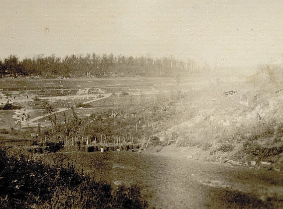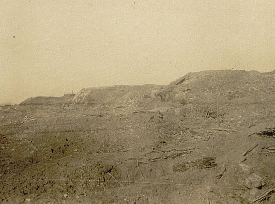 6 octobre : Le matin à 8 heures je pars avec le commandant, de Blois, Fery, Simon pour examiner, de la batterie de Souville ouest, le terrain qui nous est affecté. Le chemin qui mène au fort est assez raide au milieu de bois affreusement ravagés. Les arbres sont de plus en plus déchiquetés à mesure que nous approchons de la crête. Des anciens emplacements de batteries bouleversés et jonchés de munitions, des débris de toute sorte nous disent l’acharnement de la lutte. A la batterie ouest le bouleversement est encore plus intense mais sur le terrain qui s’étend en avant de l’observatoire et que nous dominons c’est l’anéantissement complet. De la droite à la gauche et jusqu’à l’horizon le terrain est de la même teinte uniformément brune. Rien ne vient arrêter le regard. Pas un arbre, pas un débris d’arbre, pas une ruine, pas un boyau, pas une tranchée. Rien, c’est le néant dans toute son horreur. Fleury à gauche complètement rasé est invisible. Plus à gauche la ferme de Thiaumont n’est pas plus visible. Devant nous s’étendent ce qui était autrefois les bois de Vaux Chapitre qui descendent vers le ravin du Bazil.