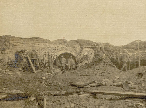 28 octobre : Pour atteindre l’abri 386 je pense qu’il vaut mieux s’y prendre de bonne heure c’est pourquoi je suis debout à 4 heures du matin. A 4h40 par une nuit noire nous partons, Lacheret et moi, équipés comme des fantassins pour être moins visibles. Jusqu’à la crête de Souville aucun incident, les boches seront calmes. Il est d’ailleurs 5 heures du matin et l’aube commence à poindre timidement, ce qui ne m’empêche pas de me prendre les pieds dans une racine et de m’étaler de tout mon long dans la boue. A partir de Souville les difficultés commencent. Il y a bien un boyau qui descend vers les carrières mais il est plein de boue jusqu’en haut. Une compagnie qui a voulu y passer ces jours derniers s’y est enlisée et 10 hommes n’ont pu être retirés de la boue. Force nous est donc de suivre le bord du boyau comme les brancardiers que nous croisons et qui ramènent des blessés. Le terrain est si bouleversé qu’ils ne sont pas trop de quatre pour porter un brancard sur l’épaule. Malgré les obus qui tombent en ce moment près de ceux que nous apercevons ils restent impassibles et continuent leur chemin. Nous sommes en effet en pleine vue des boches puisque l’ouvrage d’Hardaumont et le fort de Vaux dominent tout le terrain que nous traversons. Les boches sont heureusement assez calmes mais je me demande avec une certaine anxiété comment nous traverserons le ravin de Bazil si les boches marmitent comme hier. Le terrain est terriblement retourné et gras. La piste que nous suivons et qui escalade les trous d’obus est fort glissante et nous cherchons en vain des endroits solides où poser nos pieds. Dans un endroit particulièrement boueux je crois apercevoir une grosse pierre blanche et j’y pose le pied : je constate avec horreur que c’est le ventre d’un cadavre qui disparaît dans la boue. Nous arrivons cependant sans encombre au PC Carrières qui est encore plus misérable que je l’avais pensé : le PC se compose en effet d’une misérable galerie de 1m de large et de 4m de longueur creusée dans le roc. A droite dans un renfoncement deux cadres en fil de fer superposés ; en bas le colonel Doreau dort d’un sommeil réparateur, en haut l’officier adjoint auquel je me présente. Deux coureurs me sont donnés pour me conduire à l’abri 836. Ces coureurs, braves gens de l’escadron divisionnaire, s’empressent de se mettre à ma disposition. Naturellement pour aller au bout de notre promenade il n’est pas question de prendre le boyau puisqu’il n’y en a pas. Force nous est donc de prendre à travers le bois de Vaux Chapitre dont il ne reste d’ailleurs que des souches informes. Dans la partie française du terrain de l’attaque nous apercevons 2 ou 3 cadavres de chasseurs à pied, mais les tranchées et boyaux sont encore praticables. Dans la partie allemande, au contraire, que nous atteignons au bout de 200 ou 300 mètres c’est la dévastation absolue. Pas une tranchée, pas un boyau, quelques abris entièrement démolis, des cadavres allemands partout. Ici un bras sortant de terre barre le chemin, là d’autres cadavres sont entassés dans un abri. Le sol est littéralement jonché de casques, de fusils, de mitrailleuses, de munitions de toute sorte. Tout à coup un 105 éclate sur la piste à 100 mètres devant nous. À droite du côté du fort de Vaux les mitrailleuses crépitent. Bientôt nous arrivons au ravin du Bazil où les cadavres sont toujours nombreux. Un aspirant boche tombé à la renverse sur la piste semble dormir. A droite le ravin du Bazil est barré par l’étang de Vaux derrière la digue duquel s’étend le village du même nom dont il ne reste pas, bien entendu, la moindre trace.